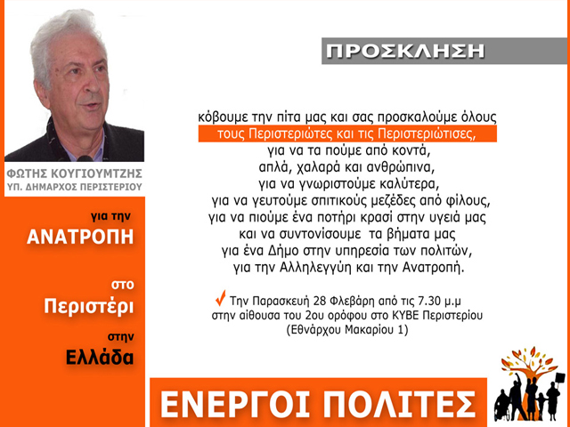 Κόβουμε την πίτα μας και σας προσκαλούμε όλους τους Περιστεριώτες και τις Περιστεριώτισες, για να τα πούμε από κοντά, απλά, χαλαρά και ανθρώπινα, για να γνωριστούμε καλύτερα, για να γευτούμε σπιτικούς μεζέδες από φίλους, για να πιούμε ένα ποτήρι κρασί στην υγειά μας και να συντονίσουμε τα βήματα μας για ένα Δήμο στην υπηρεσία των πολιτών, για την Αλληλεγγύη και την Ανατροπή.