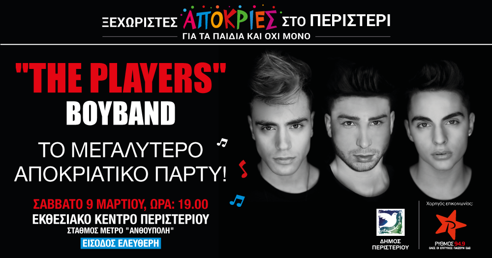 19.00 “THE PLAYERS” boyband. ΤΟ ΜΕΓΑΛΥΤΕΡΟ ΑΠΟΚΡΙΑΤΙΚΟ ΠΑΡΤΥ! – ΑΙΘΟΥΣΑ ΣΥΝΑΥΛΙΩΝ