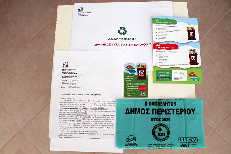 Ο φάκελος που μπορείτε να δείτε και στην παρακάτω φωτογραφία περιέχει την επιστολή που προσκαλεί τους ενδιαφερόμενους, ένα μαγνητάκι για το ψυγείο τους που αναφέρει ποια βιοαπόβλητα είναι κατάλληλα για ανακύκλωση, ένα φυλλάδιο που δίνει σημαντικές πληροφορίες για τη δράση και μια βιοαποδομήσιμη σακούλα που είναι και η κατάλληλη για το συγκεκριμένο ρεύμα ανακύκλωσης.