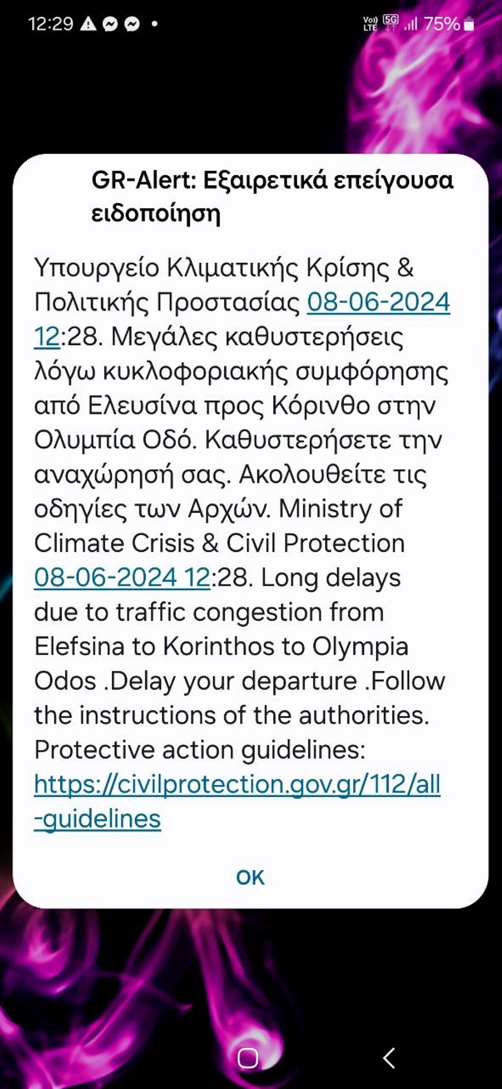 Μήνυμα μέσω του 112 εστάλη πριν λίγο στους πολίτες, προειδοποιώντας τους για μεγάλες καθυστερήσεις λόγω κυκλοφοριακής συμφόρησης από Ελευσίνα προς Κόρινθο στην Ολυμπία Οδό. Ειδικότερα το μήνυμα αναφέρει: «Υπουργείο Κλιματικής Κρίσης & Πολιτικής Προστασίας 08-06-2024 12:28. Μεγάλες καθυστερήσεις λόγω κυκλοφοριακής συμφόρησης από Ελευσίνα προς Κόρινθο στην Ολυμπία Οδό. Καθυστερήσετε την αναχώρησή σας. Ακολουθείτε τις οδηγίες των Αρχών».