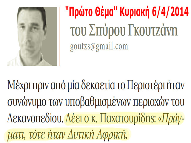 Ο απερχόμενος δήμαρχος Περιστερίου έδωσε στην εφημερίδα «Πρώτο Θέμα» την Κυριακή 6/4/2014 μια ολοσέλιδη συνέντευξη στον δημοσιογράφο Σπύρο Γκουτζάνη. Σε αυτήν, υπερακοντίζοντας την πάσα «μέχρι πριν από μια δεκαετία το Περιστέρι ήταν συνώνυμο των υποβαθμισμένων περιοχών του Λεκανοπεδίου» που εσκεμμένα του έδωσε ο δημοσιογράφος, δήλωσε: «Πράγματι, τότε ήταν Δυτική Αφρική»!!!