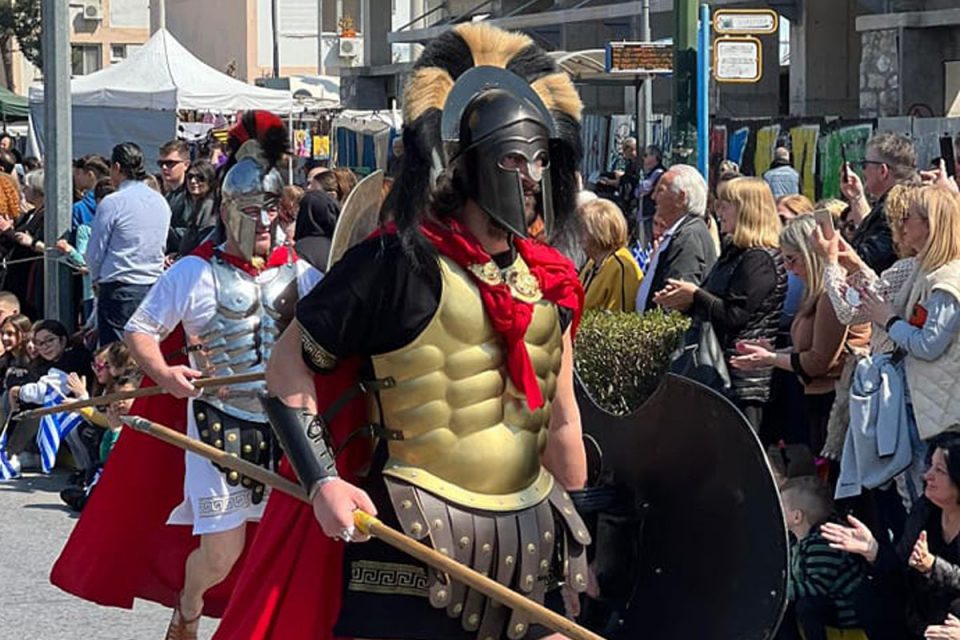 Χιλιάδες παιδιά παρέλασαν την 25η Μαρτίου 2023 στο Περιστέρι αλλά τα βλέμματα τράβηξαν τέσσερις Σπαρτιάτες με δόρατα και ασπίδες.
