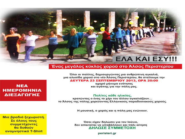 «Όλη η πόλη μια αγκαλιά», πολίτες κάθε ηλικίας θα δημιουργήσουν την Δευτέρα 23 Σεπτεμβρίου 2013 (νέα ημερομηνία διεξαγωγής), ώρα 20:00 μια ανθρώπινη αλυσίδα χορού στο νέο Άλσος Περιστερίου και θα στείλουν ένα ηχηρό μήνυμα ενότητας και αγάπης για την πόλη τους.