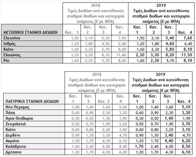 Αναλυτικά οι τιμές όλων των διοδίων ανά σταθμό διοδίων και κατηγορία οχήματος διαμορφώνονται ως εξής (με έντονους χαρακτήρες οι τιμές που αλλάζουν):