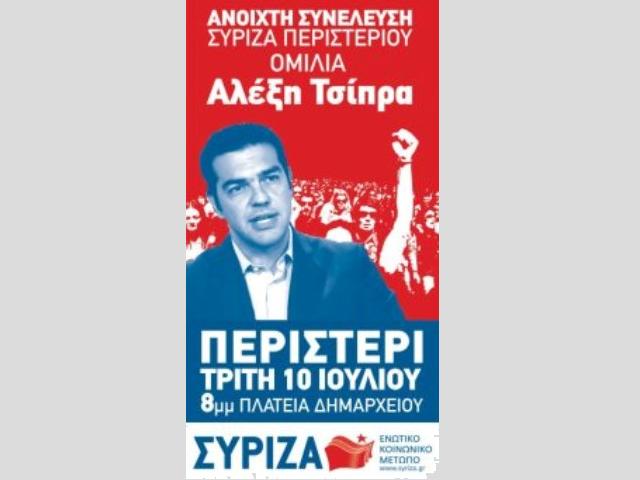 Σε Ανοικτή Συνέλευση της Τοπικής Επιτροπής Περιστερίου του ΣΥ.ΡΙΖ.Α. Ενωτικό Κοινωνικό Μέτωπο, μιλάει την επόμενη Τρίτη 10 Ιουλίου ο Πρόεδρος της Κοινοβουλευτικής Ομάδας του Συνασπισμού Ριζοσπαστικής Αριστεράς και Αρχηγός της Αξιωματικής Αντιπολίτευσης Αλέξης Τσίπρας.