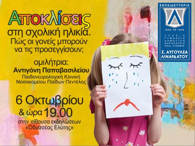 Tα Εκπαιδευτήρια Αυγουλέα-Λιναρδάτου, εγκαινιάζοντας τον νέο κύκλο των ενημερωτικών εκδηλώσεων για γονείς, μαθητές, εκπαιδευτικούς και το ελεύθερο κοινό, πραγματοποιούν στις 6 Oκτωβρίου και ώρα 19.00, στην αίθουσα εκδηλώσεων του σχολείου «Οδυσσέας Ελύτης», μια εξαιρετικά ενδιαφέρουσα ομιλία με τίτλο: