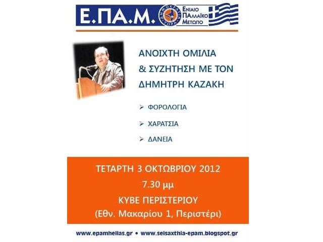 Ανοιχτή ομιλία και συζήτηση με τον Δημήτρη Καζάκη, την Τετάρτη 3 Οκτωβρίου 2012, στις 19.30, στο ΚΥΒΕ Περιστερίου (Εθνάρχου Μακαρίου 1).