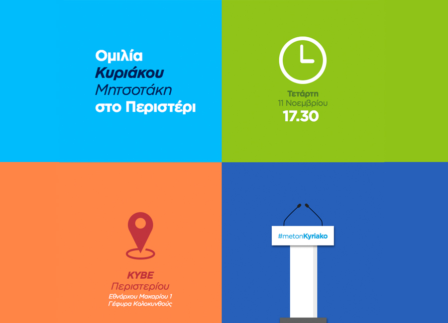 Συγκεκριμένα την Τετάρτη 11/11/2015 και ώρα 17:30 ο Κυριάκος Μητσοτάκης θα μιλήσει στο ΚΥΒΕ Περιστερίου (Εθνάρχου Μακαρίου 1 Περιστέρι – Γέφυρα Κολοκυνθούς).
