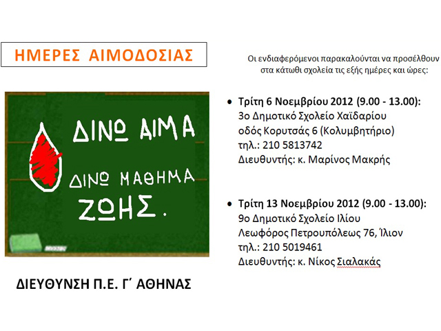 Η Διεύθυνση Π.Ε. Γ΄ Αθήνας είναι στην ευχάριστη θέση να ανακοινώσει την οργάνωση της 6ης αιμοδοσίας για την Τράπεζα Αίματος όλων των εκπαιδευτικών και εργαζομένων της Π.Ε. Γ΄ Αθήνας.