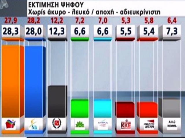 Συγκεκριμένα, η αξιωματική αντιπολίτευση προηγείται με ποσοστό 28,3%, ακολουθεί η ΝΔ με 28%, η Χρυσή Αυγή με 12,3%, το ΠΑΣΟΚ και οι Ανεξάρτητοι Έλληνες με ποσοστό 6,6% για το κάθε κόμμα, το ΚΚΕ με 5,5% και τέλος η ΔΗΜΑΡ με 5,4%.