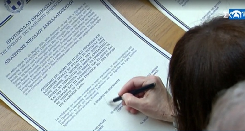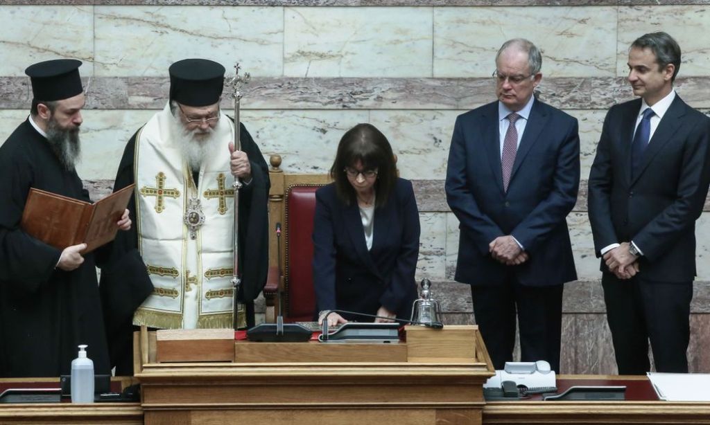 Παρουσία του Πρωθυπουργού, Κυριάκου Μητσοτάκη, και των πολιτικών αρχηγών, χοροστατούντος του αρχιεπισκόπου Αθηνών και Πάσης Ελλάδος κ. Ιερωνύμου, η κ. Σακελλαροπούλου ορκίστηκε «στο όνομα της Αγίας και Ομοούσιας και Αδιαίρετης Τριάδας» να φυλάσσει το Σύνταγμα και τους νόμους, να μεριμνά για την πιστή τους τήρηση, να υπερασπίζει την εθνική ανεξαρτησία και την ακεραιότητα της χώρας, να προστατεύει τα δικαιώματα και τις ελευθερίες των Ελλήνων και να υπηρετεί το γενικό συμφέρον και την πρόοδο του ελληνικού λαού.