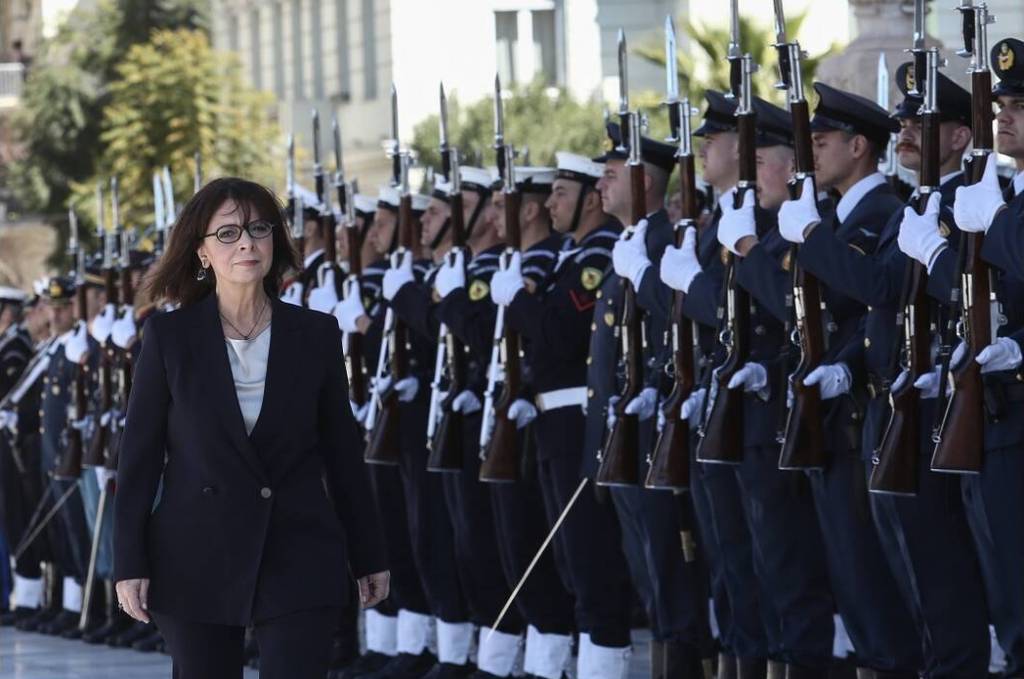 Νωρίτερα, έγινε δεκτή στο Μέγαρο της Βουλής από τον πρόεδρο του κοινοβουλίου, Κωνσταντίνο Τασούλα, και τον Πρωθυπουργό, Κυριάκο Μητσοτάκη, ενώ άγημα των Ενόπλων Δυνάμεων απέδιδε τιμές. Ως είθισται, κόκκινοι τάπητες στρώθηκαν στους διαδρόμους του κτηρίου ωστόσο τις παραδοσιακές χειραψίες αντικατέστησαν οι «επινεύσεις», όπως απαιτεί η περίσταση.