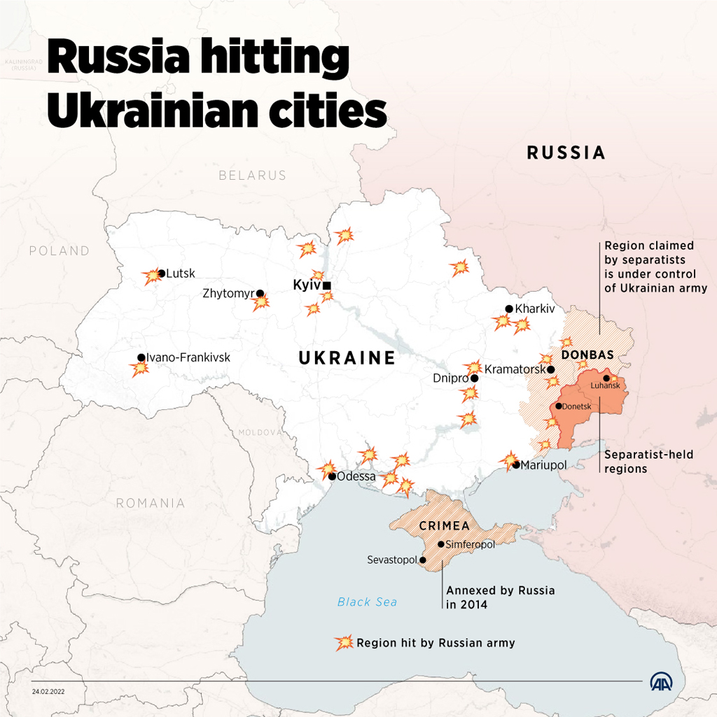 Χάρτης που έδωσε στη δημοσιότητα το Anadolou επιβεβαιώνει αυτό που έχει γίνει γνωστό από το πρωί της Πέμπτης, ότι η Ρωσία επιτίθεται στην Ουκρανία από κάθε πλευρά.
