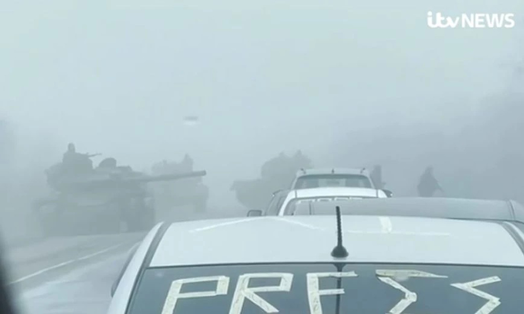 Το ρεπορτάζ του ITV αναφέρει: «Η ομάδα μας, μαζί με άλλους δημοσιογράφους και μερικούς διπλωμάτες στο τρένο με αυτοκίνητα, σταμάτησαν μόλις πέντε μίλια έξω από την πόλη.