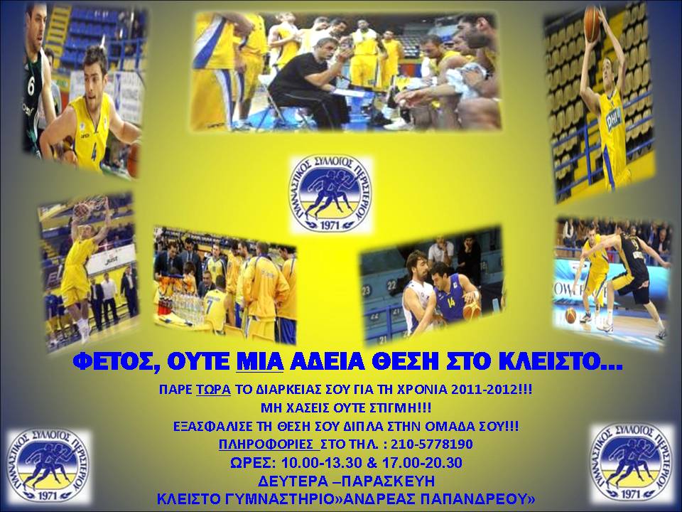 Με σύνθημα «Φέτος, ούτε μια θέση άδεια στο κλειστό» ξεκίνησε η διάθεση των εισιτηρίων διαρκείας της ΚΑΕ Περιστέρι για τη σεζόν 2011-12 και τους αγώνες της Α1 κατηγορίας.