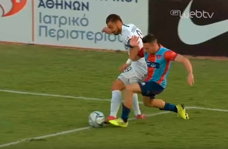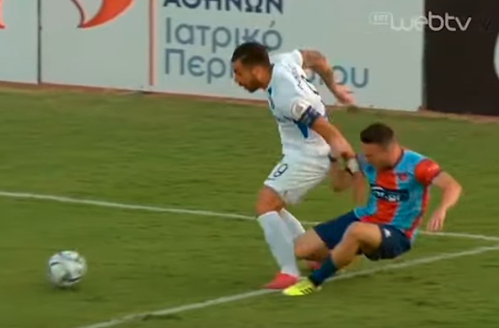 Σε αυτή τη φωτό ο αμυντικός του Πανιωνίου έχει βρει στο δεξί πόδι του Μανούσου από πίσω και στη συνέχεια ο παίκτης του Ατρόμητου πέφτει.