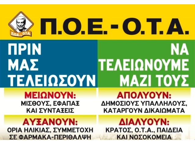 Η Π.Ο.Ε.-Ο.Τ.Α. συμμετέχει ωστόσο στην κινητοποίηση της Π.Ε.Δ.Α. με το δικό της αγωνιστικό-διεκδικητικό πλαίσιο. Κι αυτό γιατί, η πλειοψηφία των αιρετών καθυστέρησε δραματικά να αντιληφθεί τα προβλήματα που συνεπάγεται η εφαρμογή της ακραίας νεοφιλελεύθερης πολιτικής των μνημονίων που εφαρμόζουν εδώ και τρία χρόνια οι κυβερνήσεις με την τρόικα και τώρα που καταρρέουν οικονομικά οι Ο.Τ.Α. επιχειρούν αποσπασματική προσέγγιση και λύσεις… α λα καρτ. Λες και τους Δήμους δεν τους λειτουργούν εργαζόμενοι που έχουν φτάσει στα όρια της εξαθλίωσης με τη μνημονιακή πολιτική.