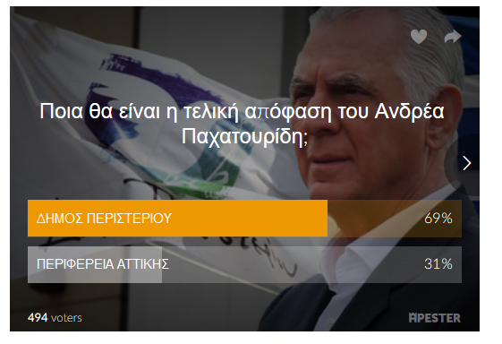 Σε ένα δείγμα περίπου 500 ατόμων, το 69% υποστήριξε την εκ νέου υποψηφιότητα του Ανδρέα Παχατουρίδη στο Δήμο Περιστερίου ενώ το 31% στην Περιφέρεια Αττικής.