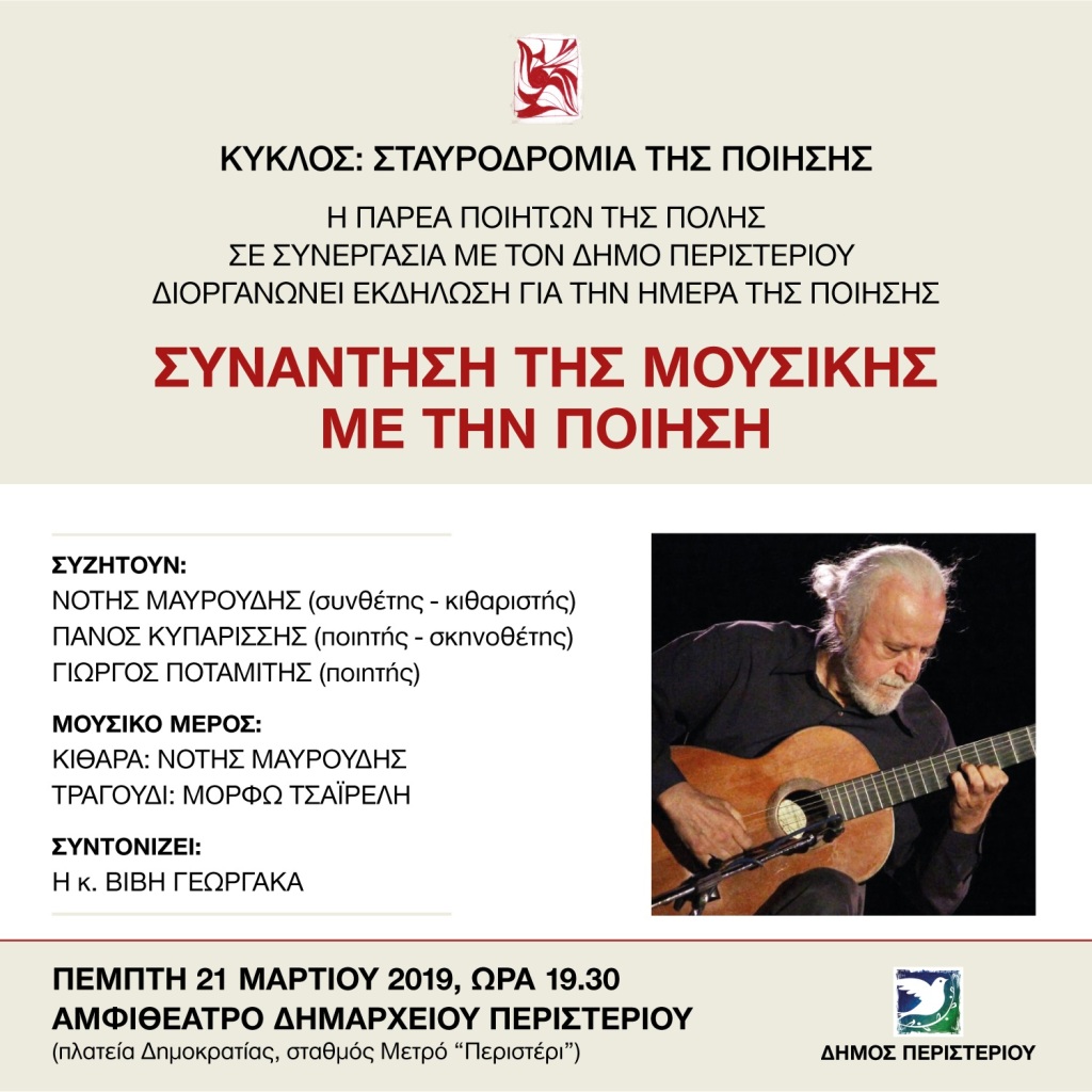 Συγκεκριμένα, η Παρέα Ποιητών της Πόλης σε συνεργασία με το Δήμο Περιστερίου διοργανώνει εκδήλωση «Συνάντηση της μουσικής με την ποίηση» για την Ημέρα της Ποίησης την Πέμπτη 21 Μαρτίου 2019, ώρα 19.30, στο αμφιθέατρο του Δημαρχείου Περιστερίου (Πλατεία Δημοκρατίας -Σταθμός Μετρό «Περιστέρι»).
