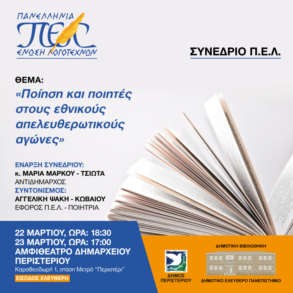 Αύριο η Δημοτική Βιβλιοθήκη Περιστερίου σε συνεργασία με την Πανελλήνια Ένωση Λογοτεχνών διοργανώνει συνέδριο με θέμα: «Ποίηση και ποιητές στους εθνικούς και απελευθερωτικούς αγώνες».