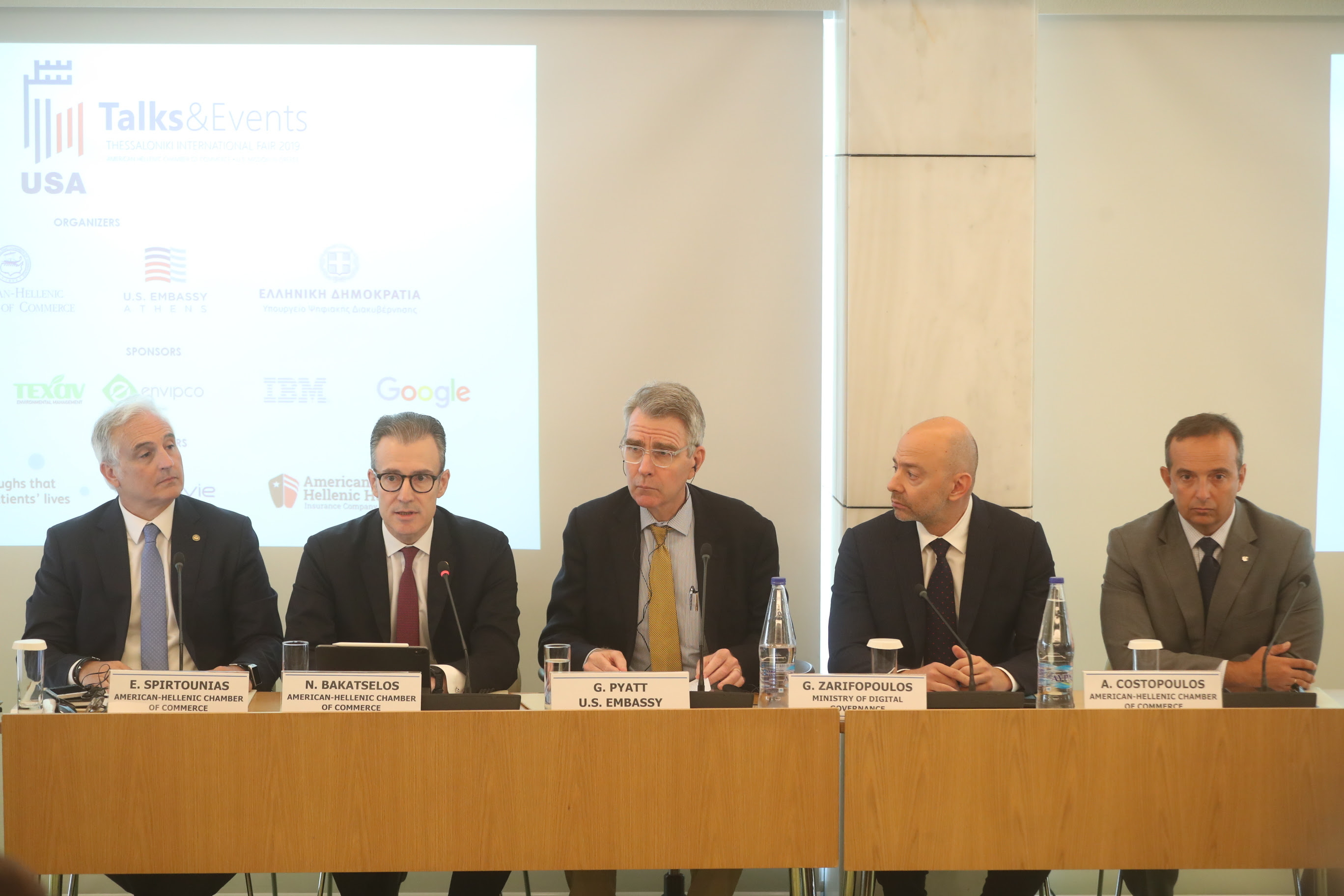 Εστιάζοντας στη φετινή συμμετοχή των ΗΠΑ στη Διεθνή Έκθεση Θεσσαλονίκης, ο Αμερικανός πρέσβης εξέφρασε την ικανοποίησή του που η χώρα του επιστρέφει στην 84η ΔΕΘ, όπου τιμώμενη χώρα είναι η Ινδία. «Η νέα μας παρουσία στη ΔΕΘ του 2019 θα εστιάσει στο να μοιραστεί τις αμερικανικές εμπειρίες τεχνογνωσίας στις εμπορικές σχέσεις, στην καινοτομία και στην τεχνολογία μέσω μιας σειράς γεγονότων, κρατώντας ζωντανή την αγορά ιδεών η οποία αποτελεί αναπόσπαστο κομμάτι της παρουσίας μας ως τιμώμενης χώρας πέρυσι» ανέφερε και πρόσθεσε: «Επί τη βάσει των πολλών συζητήσεων που είχαμε με τη νέα κυβέρνηση, τον πρωθυπουργό και το υπουργικό του συμβούλιο, εστιάζουμε επιπροσθέτως στην περικοπή της γραφειοκρατίας και στην προώθηση φιλικών προς τις επενδύσεις μεταρρυθμίσεων».
