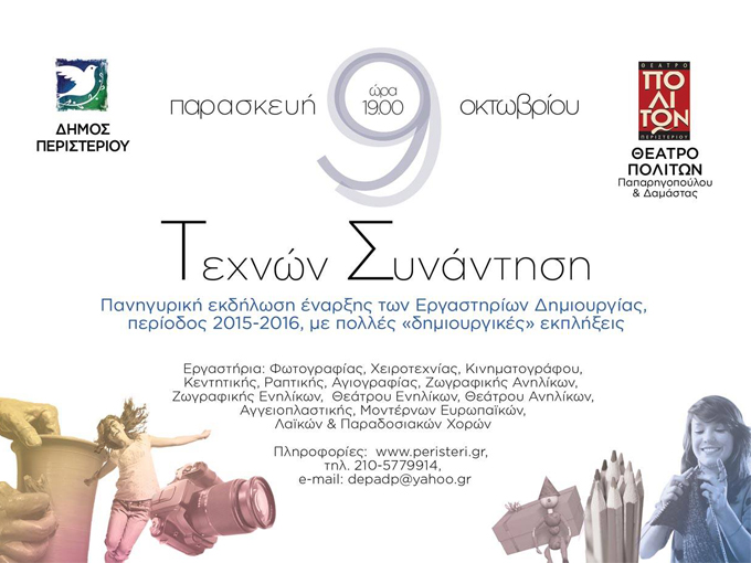 Έναρξη των Εργαστηρίων Δημιουργίας του Δήμου Περιστερίου για την περίοδο 2015-2016 πραγματοποιείται την Παρασκευή 9 Οκτωβρίου 2015, ώρα 7:00 μ.μ. στο χώρο του Θεάτρου Πολιτών (Παπαρηγοπούλου 94 – πρώην Ολυμπιακές Εγκαταστάσεις).