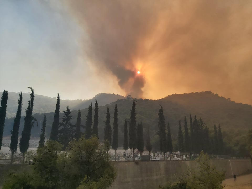 Πλέον, η πυρκαγιά καίει πυκνή βλάστηση στο Ποικίλο Όρος και εξελίσσεται πάνω από το Θέατρο Πέτρας, κοντά στην περιοχή Πανόραμα.