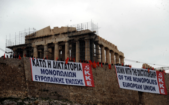 Μέλη του ΚΚΕ ανήρτησαν σήμερα στις 08.00 το πρωί δύο πανό στον αρχαιολογικό χώρο της Ακρόπολης, με σύνθημα «Κάτω η δικτατορία των μονοπωλίων της ΕΕ» γραμμένο και στα αγγλικά.