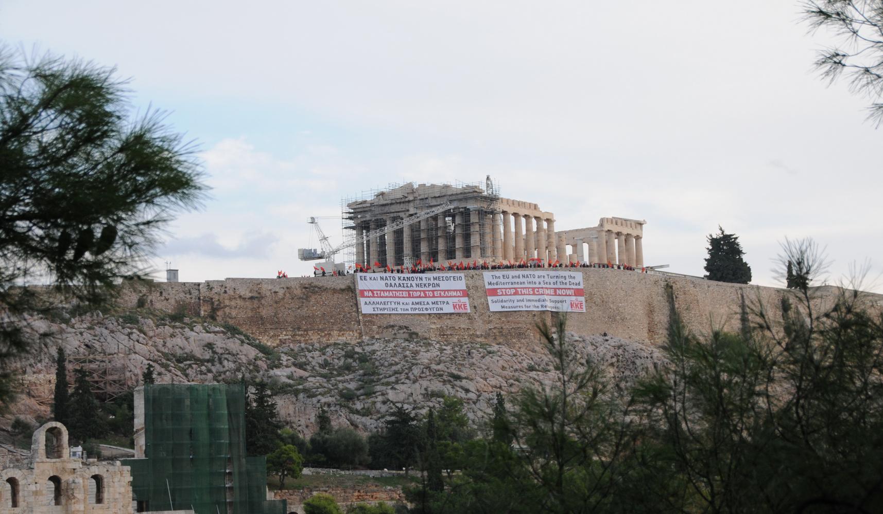 Δύο μεγάλα πανό σήκωσαν στην Ακρόπολη, νωρίς το πρωί, μέλη του ΚΚΕ και της ΚΝΕ, σε ένδειξη αλληλεγγύης στους πρόσφυγες.