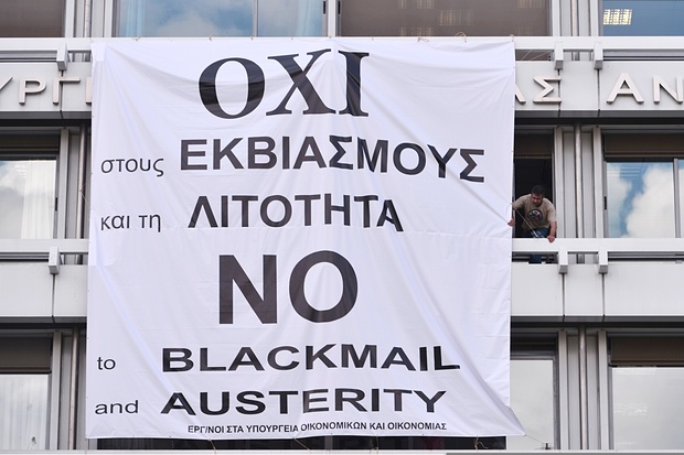 Πανό με το μήνυμα «Όχι στους εκβιασμούς, όχι στη λιτότητα» αναρτήθηκε νωρίτερα στην πρόσοψη του κτηρίου του υπουργείου Οικονομικών.