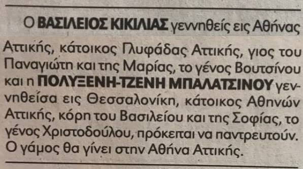 Σήμερα το πρωί δημοσιεύτηκε η αναγγελία του γάμου του Βασίλη Κικίλια και της Τζένης Μπαλατσίνου στην εφημερίδα Καθημερινή: «Ο Βασίλειος Κικίλιας γεννηθείς εις Αθήνας Αττικής, κάτοικος Γλυφάδας Αττικής, γιος του Παναγιώτη και της Μαρίας, το γένος Βουτσινού και η Πολυξένη-Τζένη Μπαλατσινού γεννηθείσα εις Θεσσαλονίκη, κάτοικος Αθηνών Αττικής, κόρη του Βασιλείου και της Σοφίας, το γένος Χριστοδούλου, πρόκειται να παντρευτούν. Ο γάμος θα γίνει στην Αθήνα Αττικής».