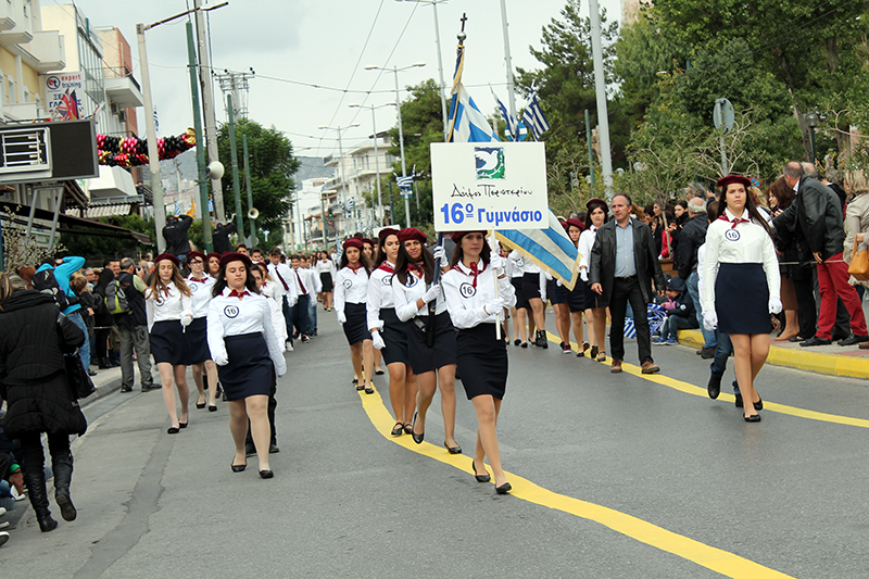Δημοτικά, Γυμνάσια, Λύκεια, φορείς και σύλλογοι παρέλασαν το πρωί της 28ης Οκτωβρίου 2016 επι της οδού Παναγή Τσαλδάρη στο Περιστέρι.