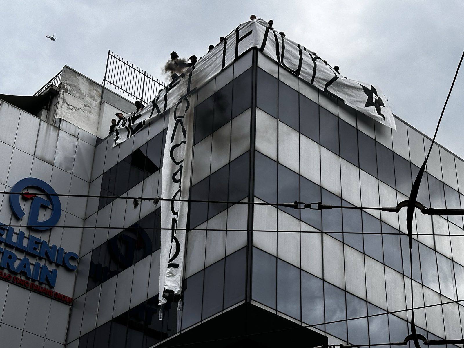 Στα γραφεία της Hellenic Train μπήκαν περίπου 20 μέλη του Ρουβίκωνας, όπου ανάρτησαν πανό για τα Τέμπη, φωνάζοντας συνθήματα.