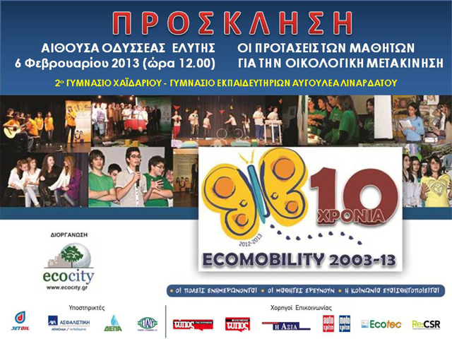 Ο Εθελοντικός Οργανισμός για το Αστικό Περιβάλλον ECOCITY, η Επιτροπή Οργάνωσης της Εκστρατείας ECOMOBILITY 2012-13 και οι συνεργαζόμενοι Επιστημονικοί Φορείς, σας προσκαλούν στην εκδήλωση παρουσίασης των εργασιών και προτάσεων για την Οικολογική Μετακίνηση, που θα παρουσιάσουν οι μαθητές της Γ’ Τάξης του 2ΟΥ Γυμνασίου Χαϊδαρίου και του Γυμνασίου των Εκπαιδευτηρίων