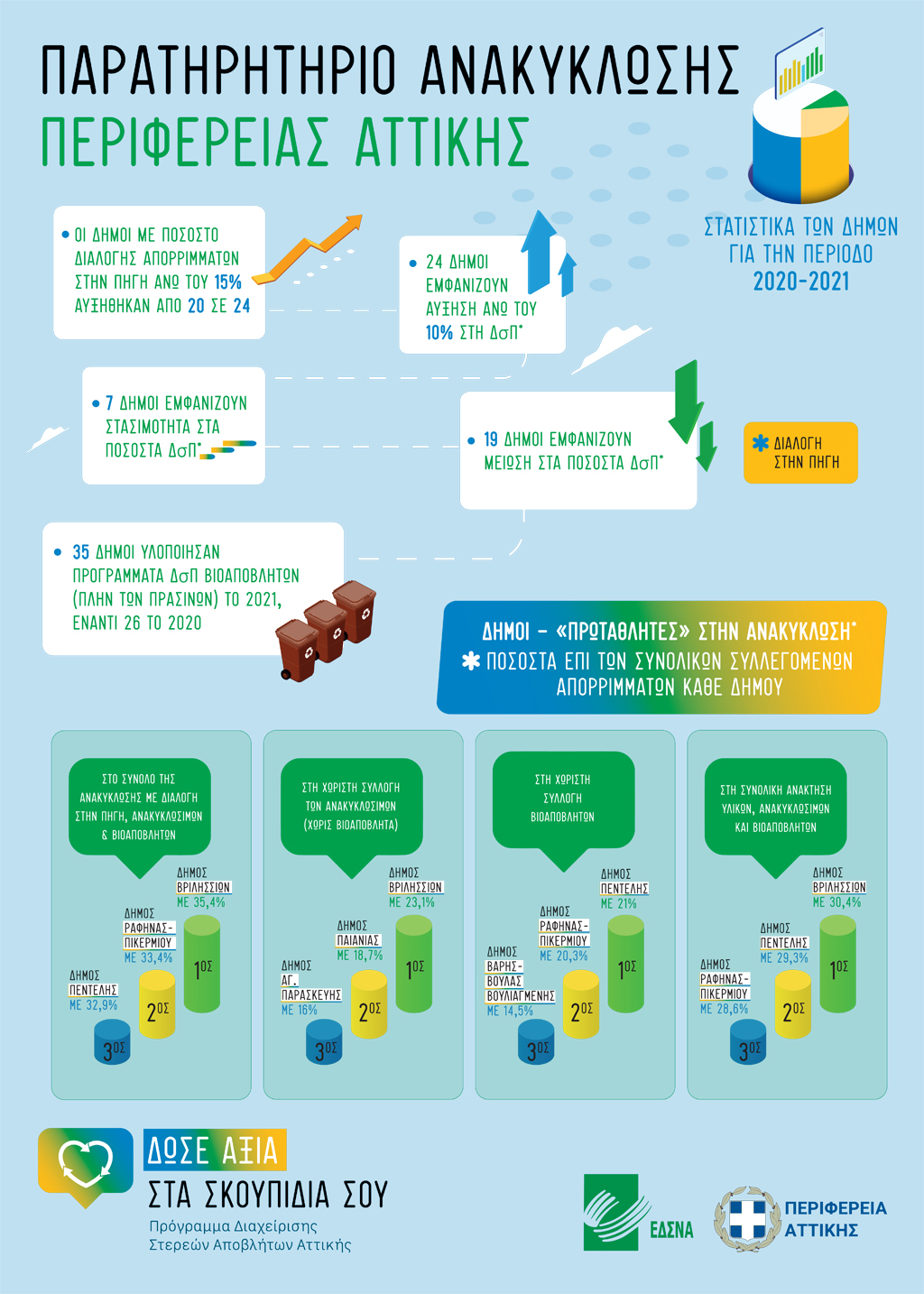 Η ανακύκλωση ανά κάτοικο και έτος στην Αττική αυξήθηκε από 55 κιλά το 2020 στα 67 κιλά το 2021. Η αύξηση είναι μεγαλύτερη στα βιοαπόβλητα (από 12 στα 19 κιλά ανά κάτοικο και έτος) και μικρότερη στα ανακυκλώσιμα υλικά (από 43 στα 48 κιλά ανά κάτοικο και έτος).
