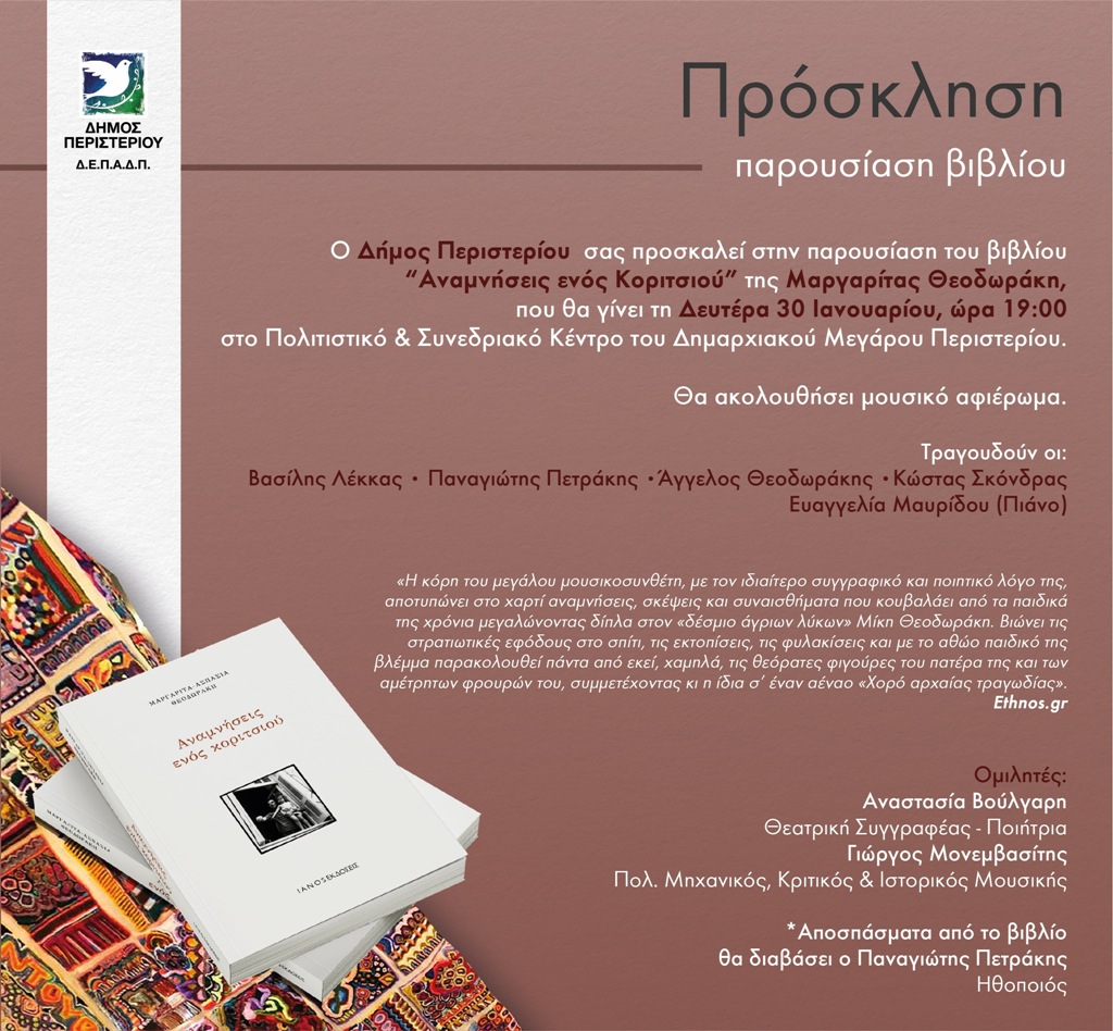 Παρουσίαση του βιβλίου της Μαργαρίτας Θεοδωράκη με τίτλο “Αναμνήσεις ενός Κοριτσιού” θα γίνει τη Δευτέρα 30 Ιανουαρίου 2023, ώρα 19:00′ στο Συνεδριακό – Πολιτιστικό Κέντρο του Δημαρχείου Περιστερίου.