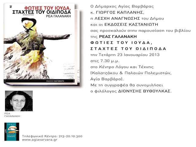 Ο Δήμαρχος Αγίας Βαρβάρας, Γιώργος Καπλάνης, η Λέσχη Ανάγνωσης του Δήμου και οι εκδόσεις Καστανιώτη παρουσιάζουν το βιβλίο της Ρέας Γαλανάκη “Φωτιές του Ιούδα, στάχτες του Οιδίποδα”