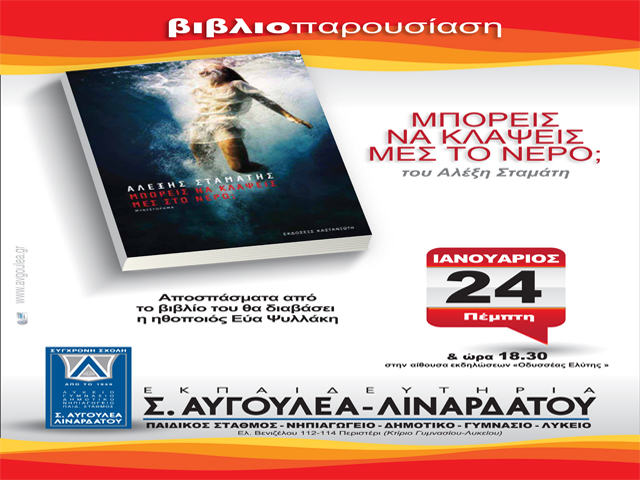 Η βιβλιοθήκη των εκπαιδευτηρίων Σ. Αυγουλέα-Λιναρδάτου, στο πλαίσιο των πολιτιστικών – επιμορφωτικών εκδηλώσεων και δράσεων που υλοποιεί, την Πέμπτη 24 Ιανουαρίου 2013 και ώρα 6.30 μμ, στην αίθουσα εκδηλώσεων «Οδυσσέας Ελύτης», παρουσιάζει το νέο βιβλίο του Αλέξη Σταμάτη «Μπορείς να κλάψεις μες στο νερό;».