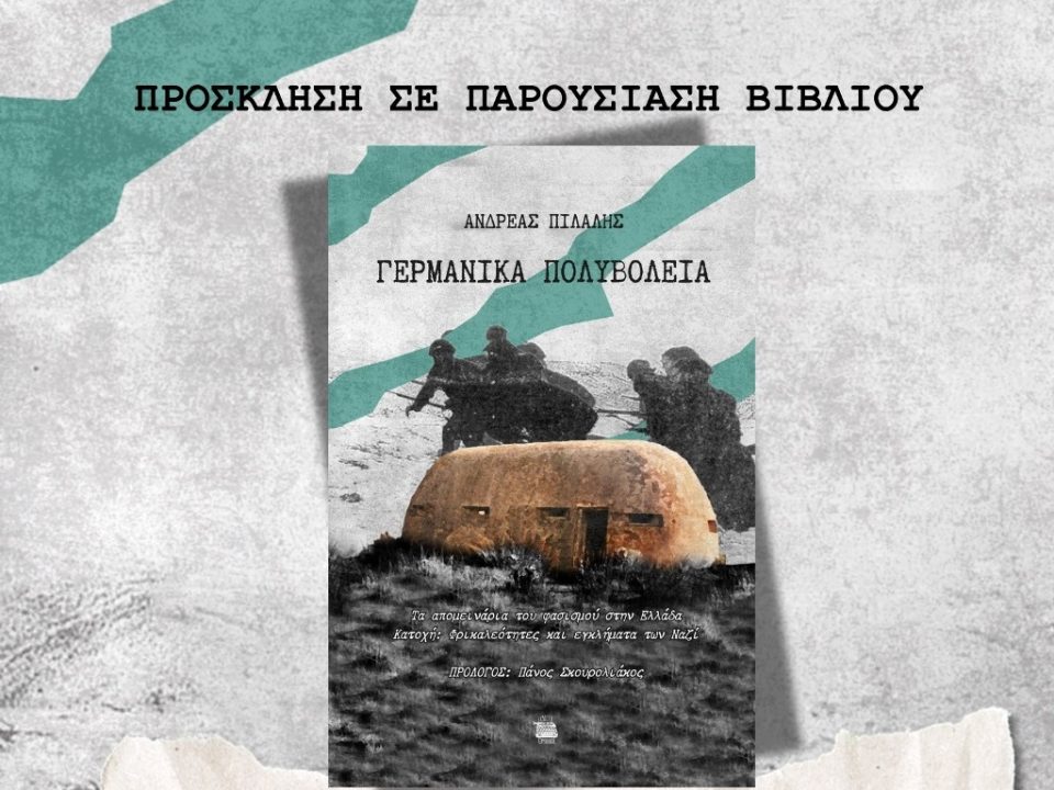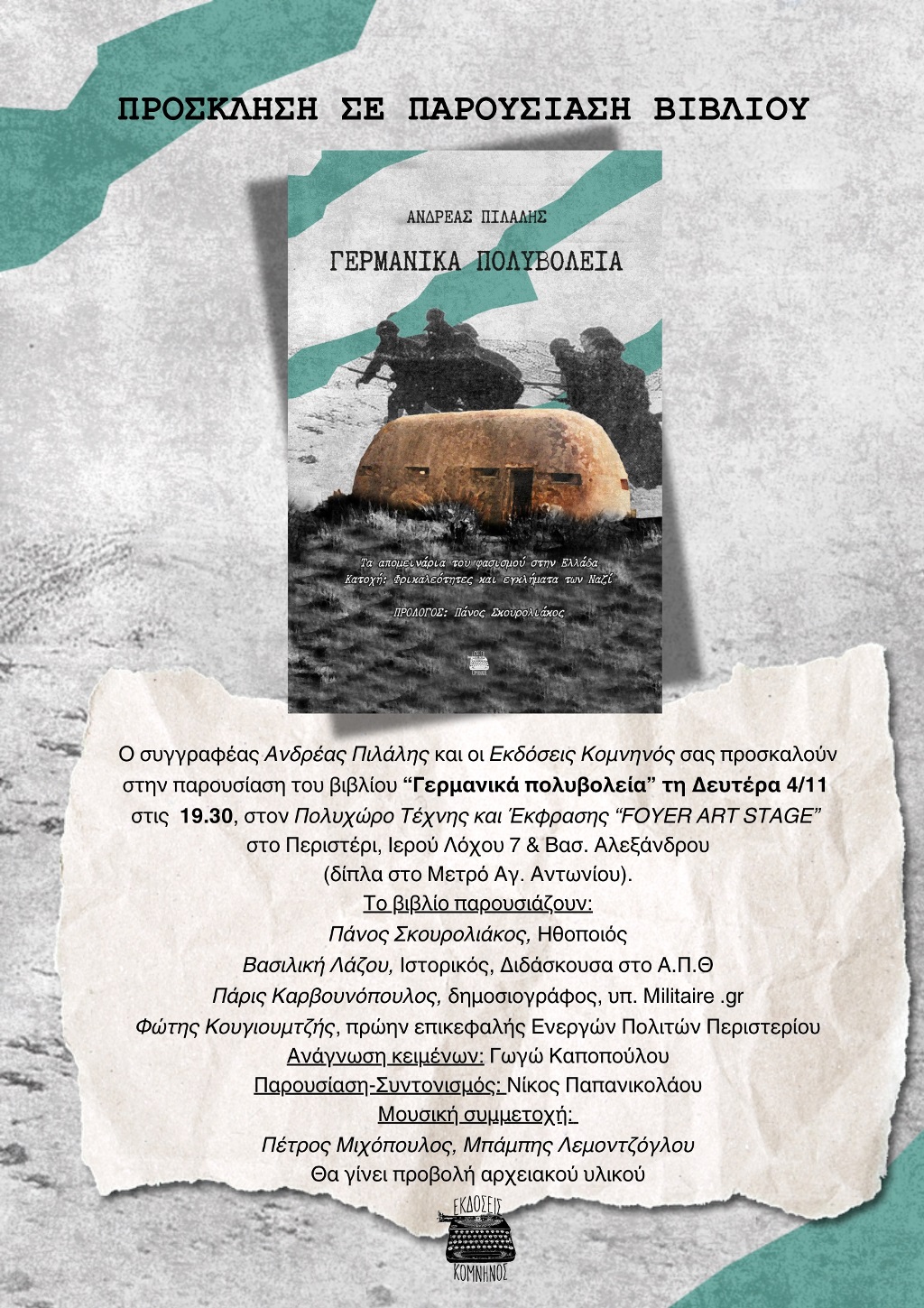Παρουσίαση βιβλίου του Ανδρέα Πιλάλη με τίτλο “Γερμανικά πολυβολεία” θα γίνει τη Δευτέρα 4 Νοεμβρίου 2024, ώρα 19:30 στον Πολυχώρο Τέχνης και Έκφρασης “FOYER ART STAGE” στο Περιστέρι, Ιερού Λόχου 7 & Βασ. Αλεξάνδρου (δίπλα στο Μετρό Αγ. Αντωνίου).