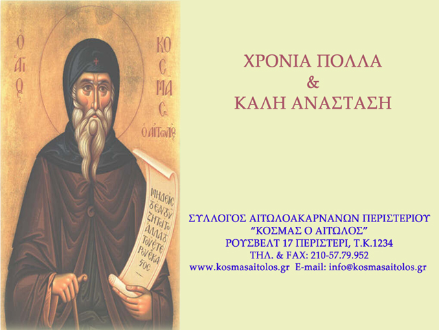 Πασχαλινές ευχές από το Σύλλογο Αιτωλοακαρνάνων Περιστερίου «ΚΟΣΜΑΣ Ο ΑΙΤΩΛΟΣ»Πασχαλινές ευχές από το Σύλλογο Αιτωλοακαρνάνων Περιστερίου «ΚΟΣΜΑΣ Ο ΑΙΤΩΛΟΣ»