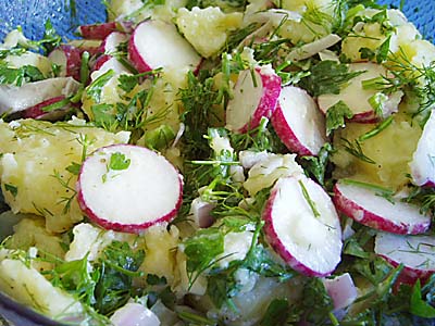 Τις βάζετε σε σαλατιέρα. Ψιλοκόβετε τον άνηθο το κρεμμύδι και το μαϊντανό και τα προσθέτετε κι αυτά. Kόβετε σε φέτες τα ραπανάκια και τα βάζετε κι αυτά στη σαλατιέρα. Τέλος προσθέτετε αρκετό αλάτι, πιπέρι, την κρέμα και το ελαιόλαδο.