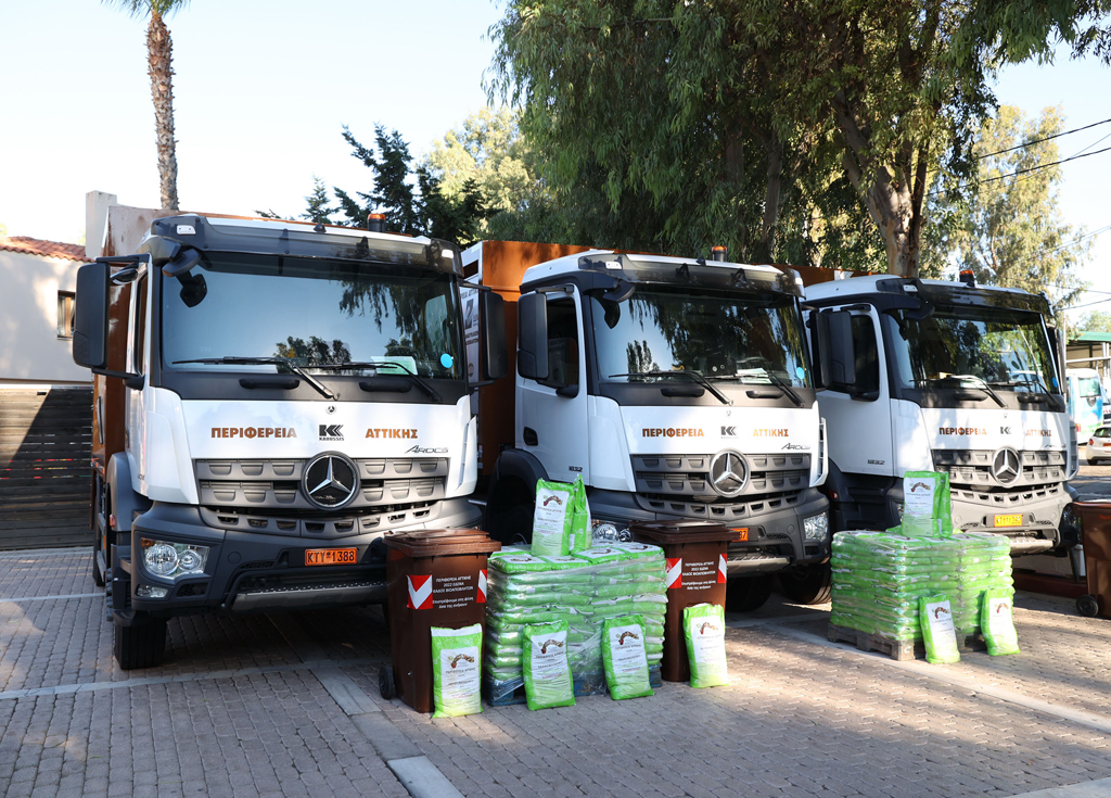Με την παράδοση στον Δήμο Περιστερίου, 4 απορριμματοφόρων συλλογής στερεών αποβλήτων, 550 καφέ κάδων ειδικής ανακύκλωσης και παλετών κομπόστ συνεχίζεται με εντατικούς ρυθμούς ο κύκλος διανομής ειδικού εξοπλισμού συλλογής βιοαποβλήτων και ανακυκλώσιμων υλικών από την Περιφέρεια, σε δήμους της Αττικής. Τον εξοπλισμό παρέλαβε από τον Περιφερειάρχη Αττικής, ο Δήμαρχος Περιστερίου Α. Παχατουρίδης, συνοδευόμενος από την Αντιδήμαρχο Περιβάλλοντος, Μ Τσιώτα.