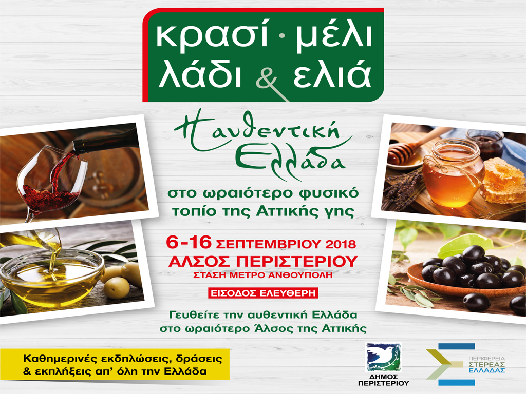 Η 2η μεγάλη έκθεση «Κρασί – Μέλι – Λάδι & Ελιά» ξεκινά την Πέμπτη 6 Σεπτεμβρίου 2018 με διάρκεια έως και τις 16 Σεπτεμβρίου 2018, στο ομορφότερο Άλσος της Αττικής, το Άλσος Περιστερίου (στάση Μετρό “Ανθούπολη”). Είσοδος ελεύθερη!