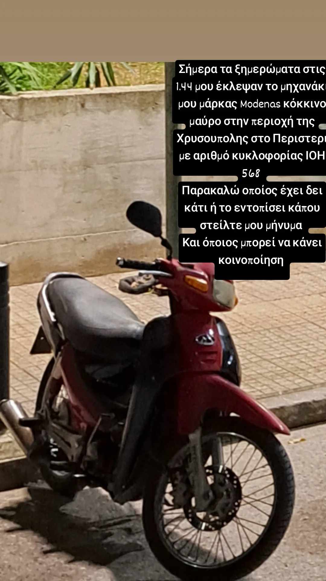 Όπως ενημερωθήκαμε το βράδυ της Τετάρτης, 7/5, για καλή τύχη των ιδιοκτητών, το μηχανάκι βρέθηκε στο θέατρο Φοίνικα με μικρές ζημιές.
