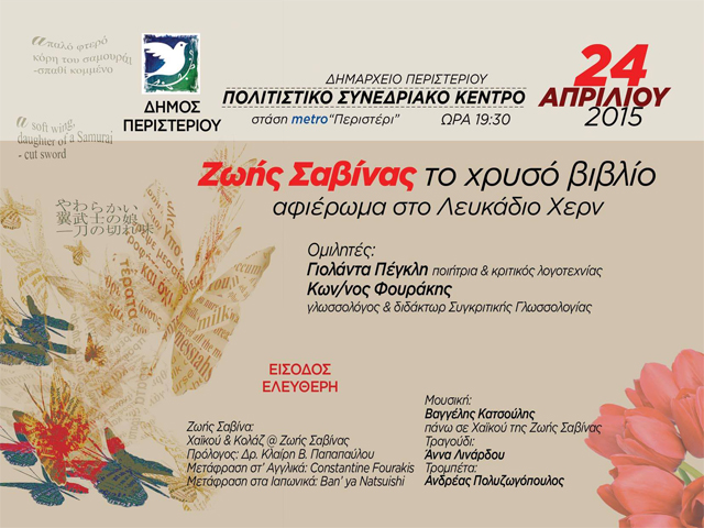 Στα πλαίσια των πολιτιστικών δράσεων του Δήμου Περιστερίου, παρουσιάζεται “Χαϊκού & Κολάζ – Το χρυσό βιβλίο” της Ζωής Σαβίνα, στις 24 Απριλίου, ώρα 19:30 στο Πολιτιστικό – Συνεδριακό Κέντρο του Δημαρχείου Περιστερίου (Καραθεοδωρή και Εθν. Αντιστάσεως, Σταθμός Μετρό “Περιστέρι”. Είσοδος Ελεύθερη.