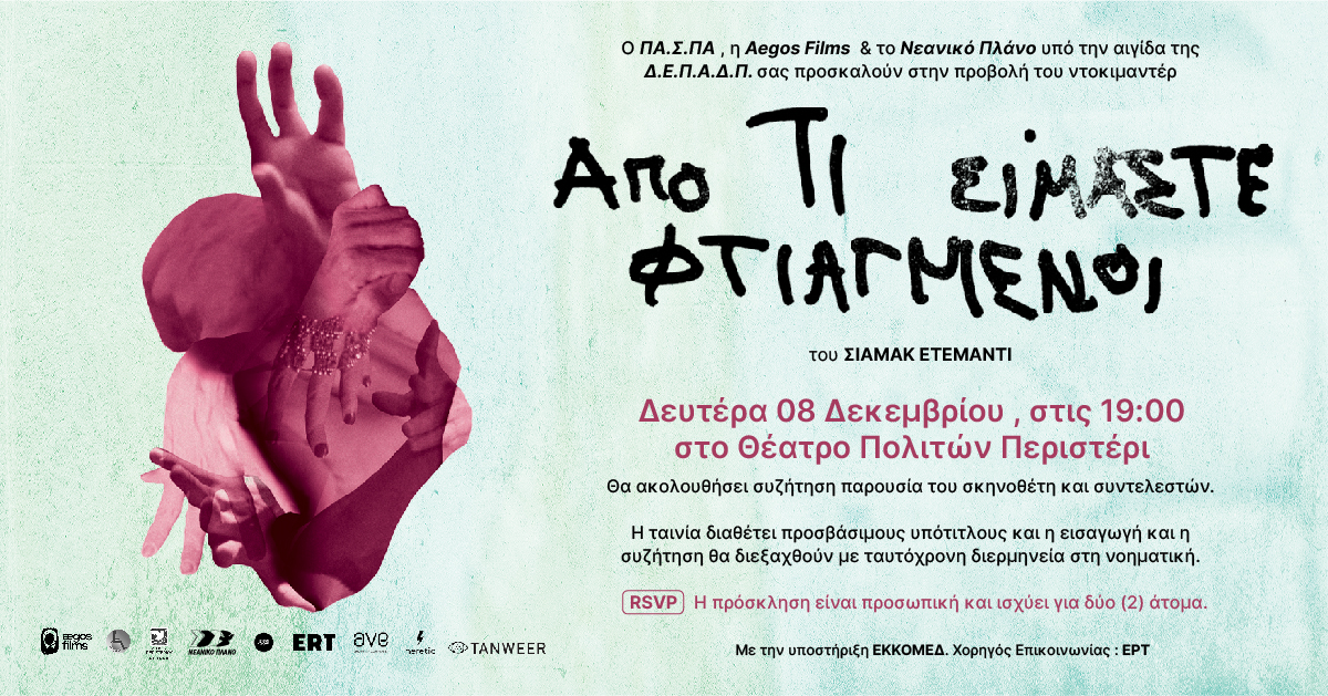 Μια ιδιαίτερη εκδήλωση με επίκεντρο τον έρωτα, την επιθυμία και την εμπειρία της αναπηρίας διοργανώνει ο Πανελλήνιος Σύλλογος Παραπληγικών (ΠΑ.Σ.ΠΑ.), σε συνεργασία με τη Δημοτική Επιχείρηση Πολιτιστικής Ανάπτυξης Δήμου Περιστερίου (ΔΕΠΑΔΠ) και υπό την αιγίδα του Δήμου Περιστερίου. Τη Δευτέρα 8 Δεκεμβρίου 2025, στις 19:00, το Θέατρο Πολιτών θα φιλοξενήσει την ειδική προβολή του ντοκιμαντέρ «Από Τι Είμαστε Φτιαγμένοι» του Σιαμάκ Ετεμάντι. Η προσέλευση θα ξεκινήσει στις 18:00.