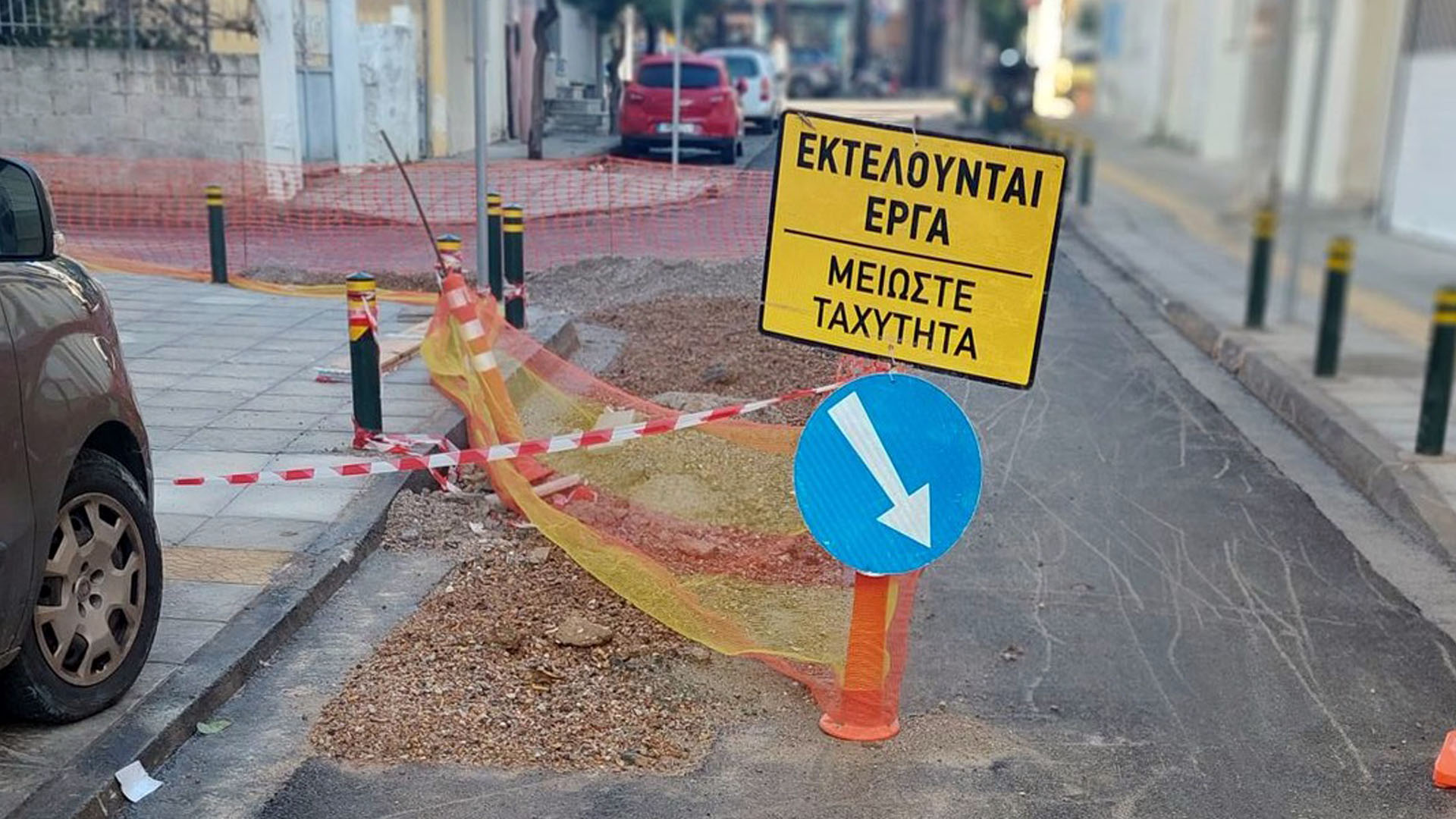 Όπως αποτυπώνεται και στις φωτογραφίες που μας απέστειλε κάτοικος της περιοχής, το οδόστρωμα είναι πρόχειρα αποκλεισμένο με κορδέλες, πλαστικά πλέγματα και σήμανση εργοταξίου, ενώ η διέλευση οχημάτων γίνεται με παράκαμψη.