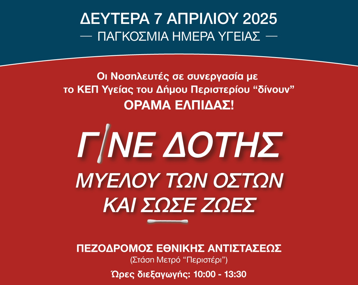 Συγκεκριμένα, η Ένωση Νοσηλευτών Ελλάδος σε συνεργασία με το ΚΕΠ Υγείας του Δήμου Περιστερίου και τον Σύλλογο «ΟΡΑΜΑ ΕΛΠΙΔΑΣ», διοργανώνουν ενημερωτική – εθελοντική δράση για την προσέλκυση νέων εθελοντών δοτών μυελού των οστών, για τους δημότες του Περιστερίου.
