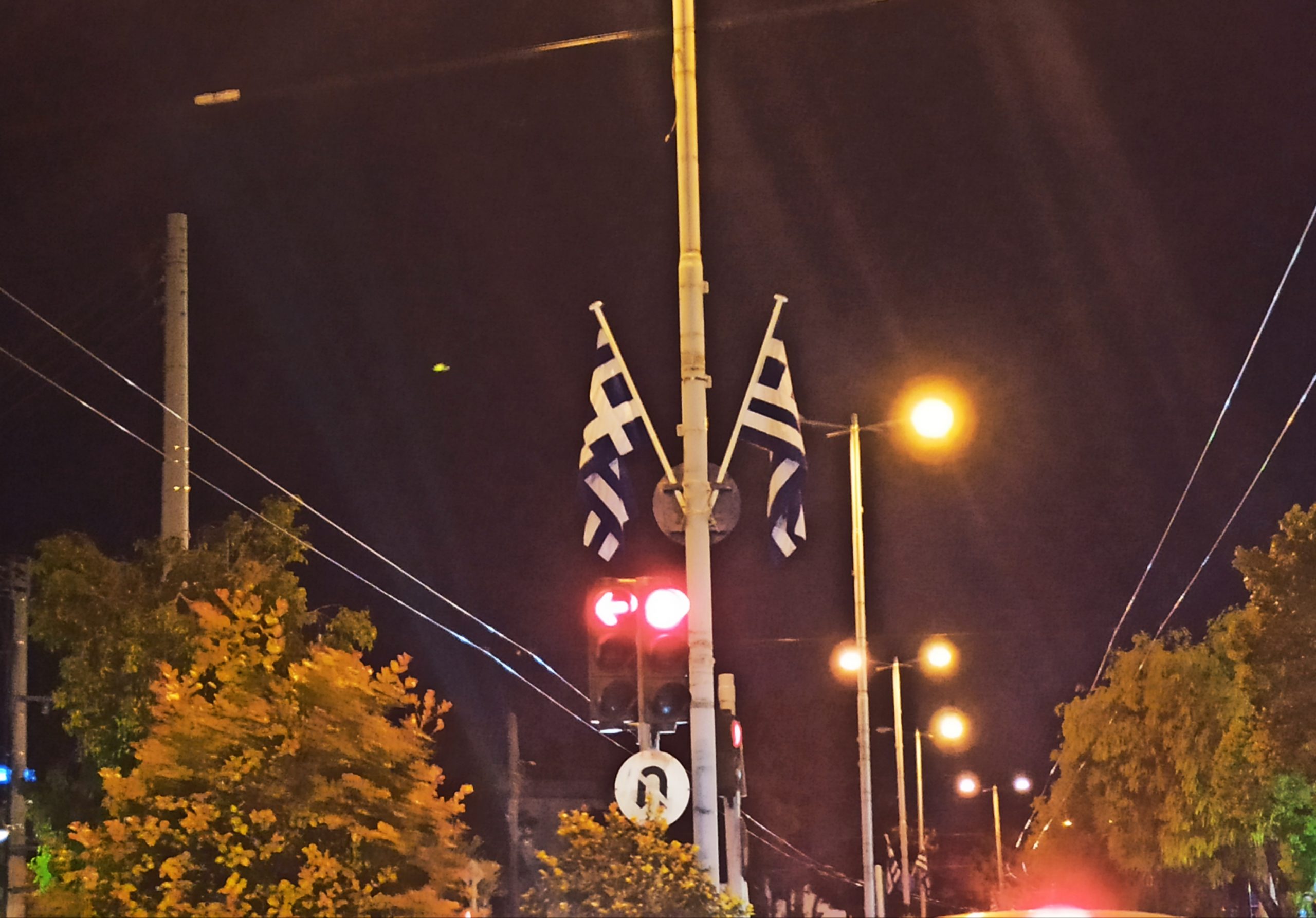 Πρόκειται για μια γκάφα από τα συνεργεία που τοποθέτησαν τις ελληνικές σημαίες αφού μια από αυτές τοποθετήθηκε ανάποδα πιθανότατα εκ παραδρομής.