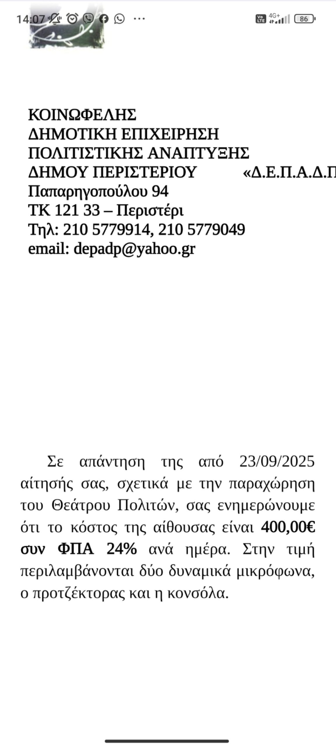 Η επιστολή διαμαρτυρίας της ερασιτεχνικής θεατρικής ομάδας Ab Intus προς τον Δήμο Περιστερίου.